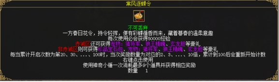玩家每次开启棠风逐蝶令必得50000经验。玩家累计开启20、30、…90、100个棠风逐蝶令,则第20、30、…90、100次开启棠风逐蝶令获得2、3、…9、10倍奖励,然后重新开始计数。