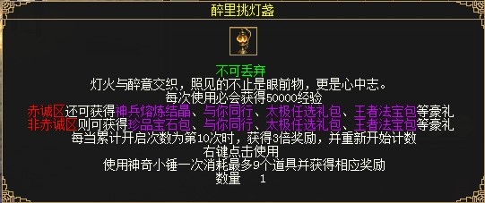 玩家每次开启醉里挑灯盏必得50000经验。玩家累计开启10个醉里挑灯盏,则第10次开启醉里挑灯盏获得3倍奖励,然后重新开始计数。