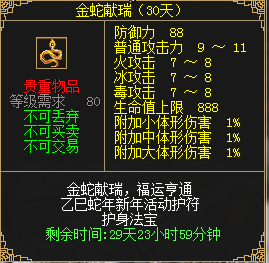 红利可兑换摩诃般若·藏碎片*1、刀剑壁•藏碎片、白泽之灵、貔大虎碎片、护符:金蛇献瑞(30天)、护符:灵蛇贺新(30天)、凤凰坐骑(30天)等道具